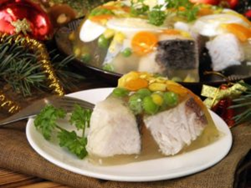The gentle taste of jellied fish will perfectly complement the lean Christmas Eve table. To cook the dish you’ll need fish, bulb onions, carrots, vinegar, gelatin, and spices. This dish has to be refrigerated before serving since jellied fish needs time to set.